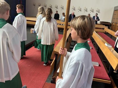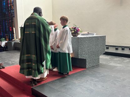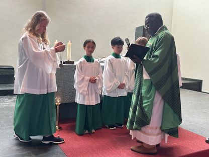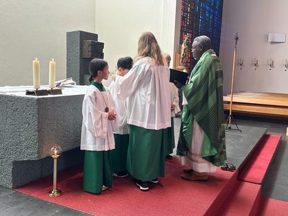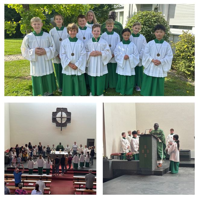 Am Sonntag nahm Pfarrer Joseph drei Ministranten in die Reihe der Messdiener*innen unserer Gemeinde auf. Er freute sich sehr darüber, dass Marlén Stupin, Eric Rüdlin und Tom Schröder sich für den Dienst am Altar entschieden haben. Er betonte noch einmal, wie wichtig dieser Dienst ist. Nach der Aufnahme, in der Marlén, Eric und Tom versprachen ihren Dienst gewissenhaft und mit Freude zu verrichten, segnete Pfarrer Joseph die Minstrant*innen. Stellvertretend für alle Ministranten überreichte ihnen Paulina Jäger die Messdienerplaketten. Perfekt gerüstet, begannen Marlén, Eric und Tom ihren Dienst. Wir wünschen den dreien alles Gute, Gottes Segen, Ausdauer und viel Freude bei ihrem Dienst am Altar.